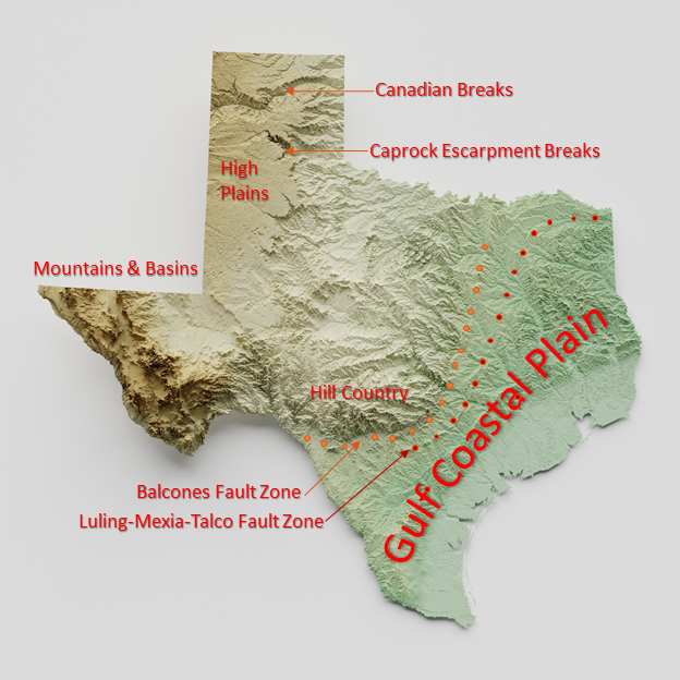 Texas is diverse, too. Altitude ranges from broad expanses of sea-level wetlands along the Gulf Coast to 8,749 feet on the top of Guadalupe Peak in West Texas. Rugged mountains and desert basins are found in West Texas. Flat wind-swept high plains, bounded by the spectacular canyons of the Caprock Escarpment dominate the Panhandle. Rolling prairies and scattered woodlands dominate the central part of the state, uplifted and eroded along the Balcones Fault that traces just west of Interstate 35. East and south of the fault, grassland, forest, and savannah landscapes are gently rolling as they slope and flatten to the coastal plain along the Gulf and the subtropical climates of the Lower Rio Grande Valley. The physical geography, or physiography, of Texas supports an abiotic diversity of geology, climate, and soils that produce a biotic diversity of plants and animals reflected in Texas’ ecoregions.